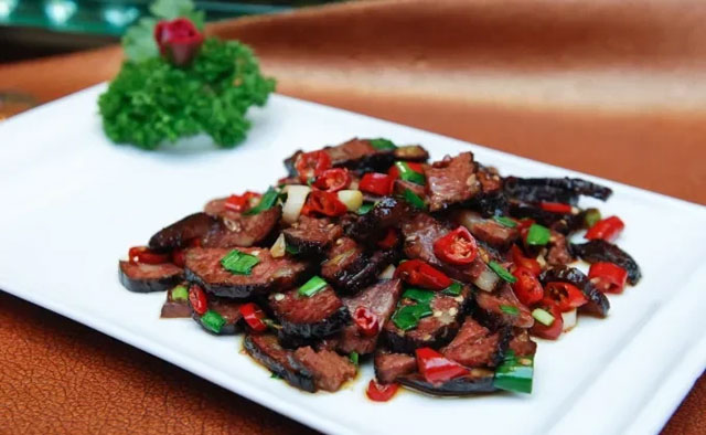 金寨江湖菜里的红豆腐,是当地人下饭菜肴中必备的一道。红色是它个性的外表,风干的滋味是它的内涵,它永远在金寨的美食谱中占有一席之地。