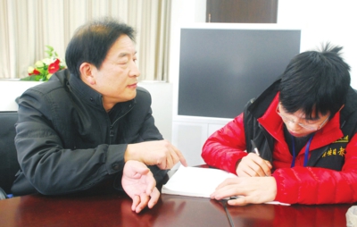 图为廖家同(左)向记者介绍金寨县名的由来