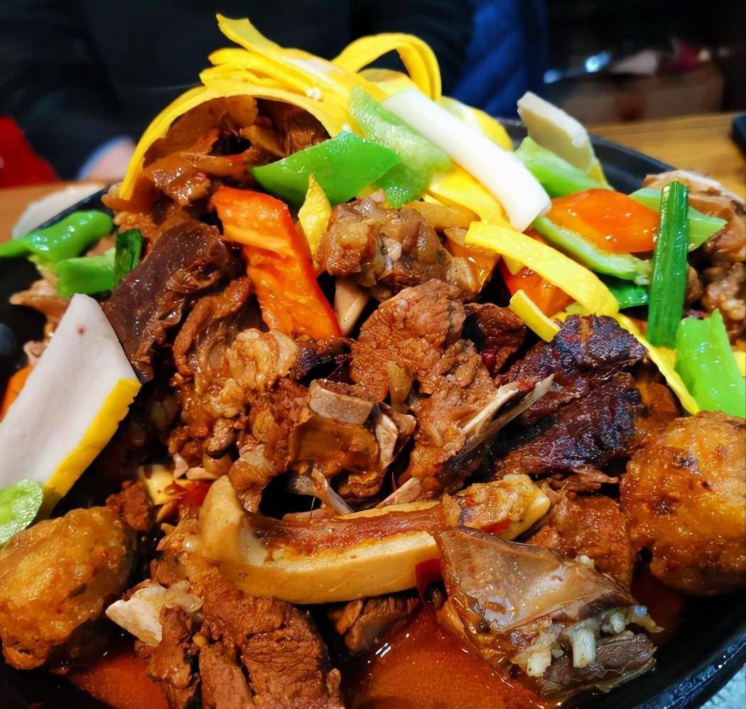 然后将烧熟的主菜如天堂寨小河鱼、老鸡公、黄鳝、羊、牛、狗、野猪肉倒入锅内,锅边再配上橡子豆腐、红豆腐、泡菜等。