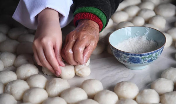 把捶好的糯米团倒入干净的容器中,用手均匀的把糯米揉成拳头大小的糍粑团。通常刚捣成的糍粑,还很热乎,小孩们都会放些糖蘸着吃。冷却后,切成块状保存。煮面时放两块或单独做成点心吃都可以。冬天山里人,喜欢烤炭火,一家人围着暖烘烘的火炉,顺便烤两块糍粑,边吃边聊,其乐融融。