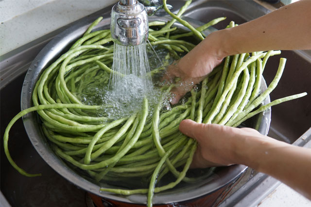 1、这里的长豆角超不多用了10斤,如豆角比较鲜嫩,掐去头就可以了,如果豆角长得有些老或者不是很新鲜的话,要掐去头撕掉老筋,找一个较大的盆,用清水冲洗几次,将其表面的浮尘与杂质冲洗掉。