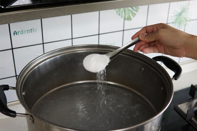 2、用的是家里最大的蒸锅,一次可以多煮一些,比较节省时间,锅中加入大半锅的清水,加入3大勺盐,大火煮开。