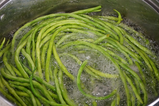 3、锅中水开后,加入豆角开大火再次煮开,继续煮5分钟左右,这时的豆角会微微变黄,也变得比较软,用筷子挑起来豆角自然下垂。