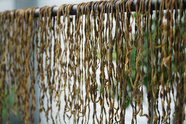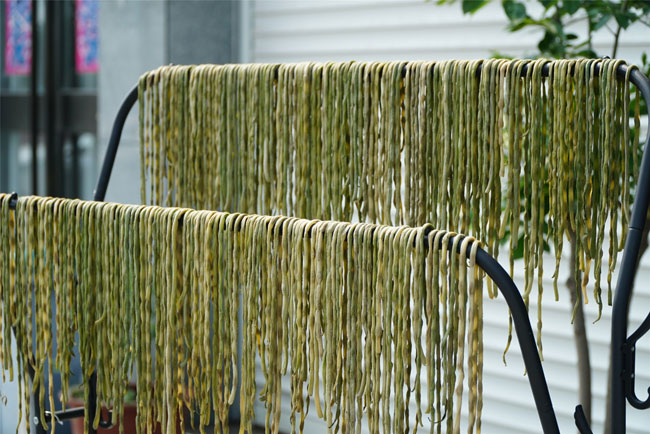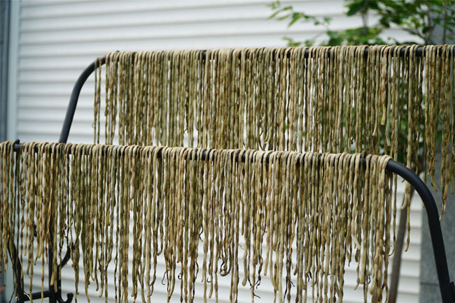 晾了3个小时的豆角,水分在慢慢地蒸发,豆角的表皮已经比较皱了,而且颜色也在慢慢变化,现在豆角已变成了黄褐色。
