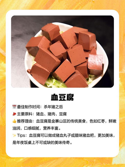 口感:血豆腐口感细腻,鲜嫩油润,经过日晒烟熏,成就了年夜饭桌上不可或缺的美味传奇。